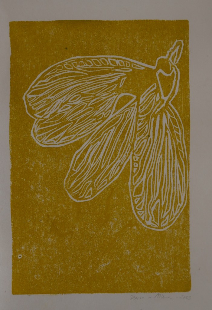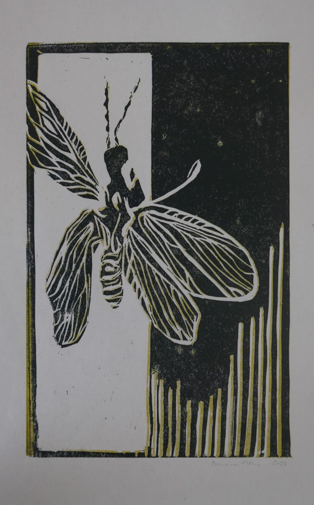 Miniscule details, bijzonder fijn gebouwd met gemene tanden. Rara wat is dat? Een insect gevangen in barnsteen. De extreme macro foto’s van Enrico Bonino van inclusies in barnsteen bieden altijd weer een verrassing. En een uitdaging om er een linosnede van te maken.