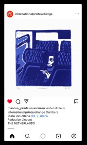 A train trip resulted in ‘Out there’, 14 x 14 cm linocut, for the lovely annual International Print Exchange.